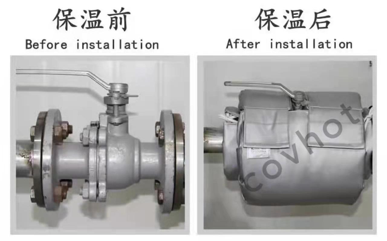 例:以一個DN100的法蘭式截止閥在蒸汽溫度110℃的管線上,如果不做保溫,一年會造成10.4噸的蒸汽損失。以蒸汽成本200元/噸計算,僅僅散熱損失就達2080元/年。如果安裝covhot柔性可拆卸保溫套(3cm厚度玻璃纖維保溫材料)以后,減少熱損失4噸/年,也就是800元/年。從這個例子可以很明顯的看出安裝可拆卸保溫套保溫隔熱效果以及節能價值。
