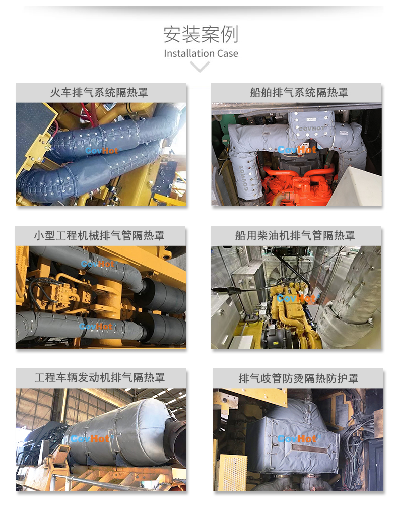 排氣管隔熱套主要用于船用柴油機排氣系統(tǒng)保溫隔熱、發(fā)電機配套動力系統(tǒng)排氣保溫隔熱、礦山車輛發(fā)動機排氣系統(tǒng)保溫隔熱等其他類型的車輛排氣系統(tǒng)保溫隔熱。